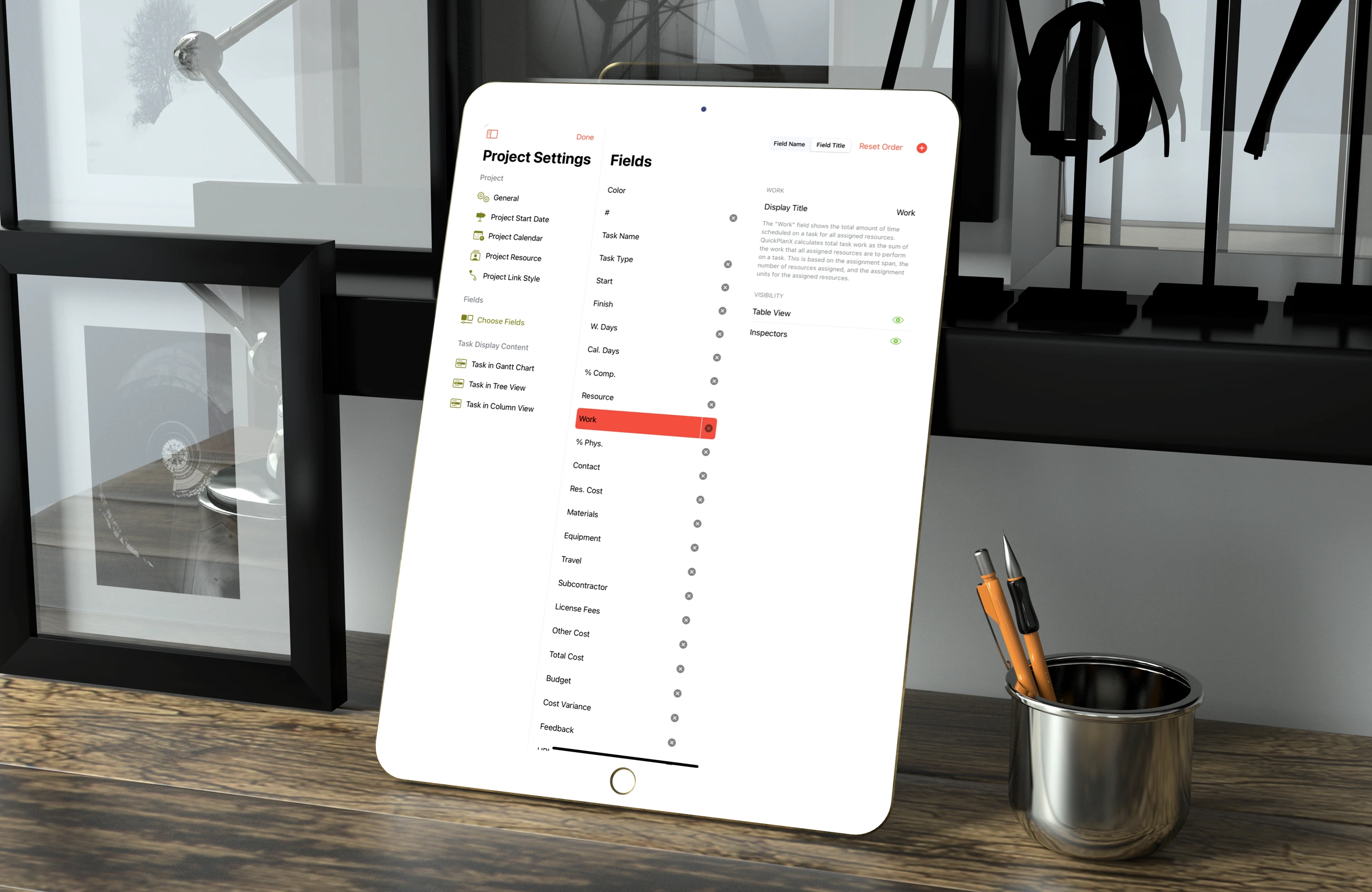 QuickPlanX offre une personnalisation étendue pour s'adapter à votre style unique de gestion de projet. Configurez les paramètres au niveau du projet, y compris les dates de début/fin, les ressources et les types de liens. Personnalisez les champs pour saisir les informations exactes dont vous avez besoin. Affinez l'affichage des barres de tâches dans les diagrammes de Gantt, les éléments dans les vues Arborescence et Colonnes, et personnalisez l'interface utilisateur pour créer votre espace de travail idéal.