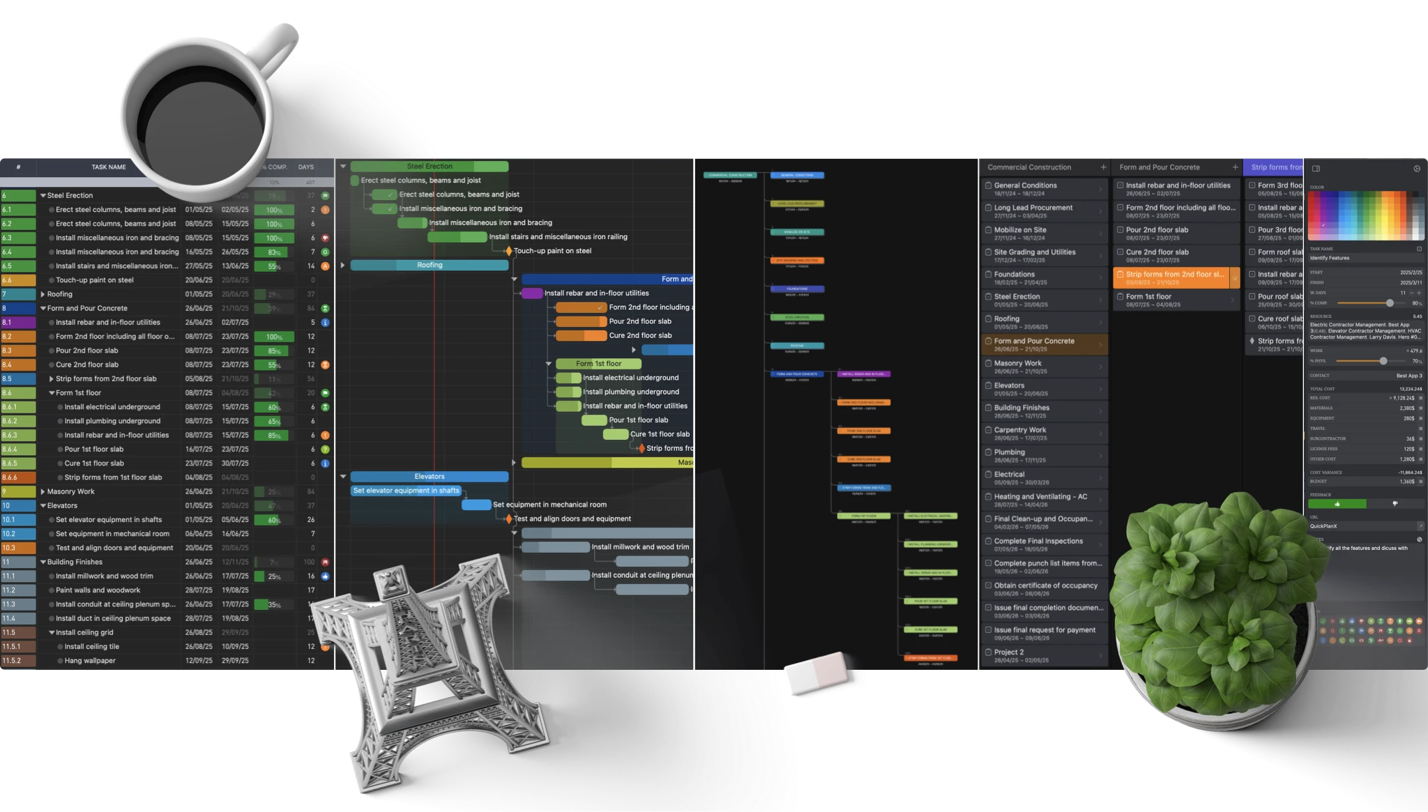 よりスマートなビューとスムーズな操作で、思考の速さで作業を進めましょう。タスクの整理、データのインポート、直感的なジェスチャーとドラッグ&ドロップによる一括編集が簡単に行えます。テーブル、ガント、ツリー、カラムビューを駆使して、QuickPlanXは迅速な作業と整理をサポートします。